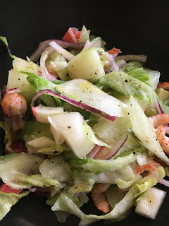 Enklare kan det inte bli!!! I veckan slog vi till med en smaskig kräftsallad. Jag åt som en häst! Den går att variera efter vad man har hemma och tycker om (tomater, gurka, ruccola osv). För 3-4 portioner till middag använde vi ungefär mängden som är angiven i receptet. Det fungerar också som en förrätt till betydligt fler :)